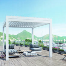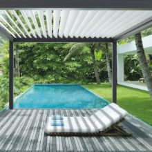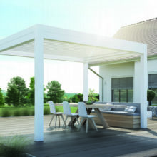 La pergola avec toit à lames. Les lamelles réglables en continu génèrent non seulement une circulation d’air naturelle et rafraîchissante, mais assurent aussi une protection optimale contre les intempéries. En cas d’averse, les lames fermées retiennent l’eau et la redirigent vers les gouttières intégrées à la construction de support.